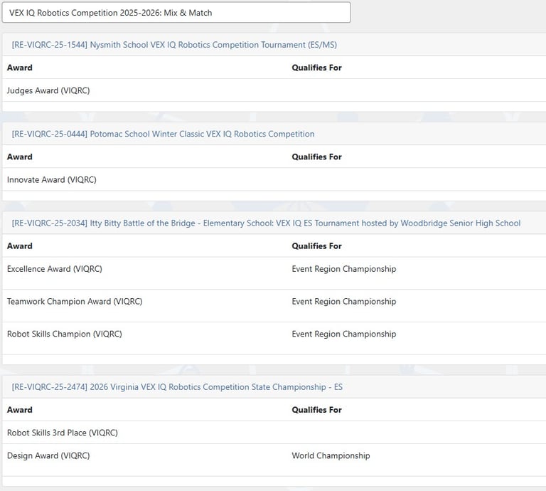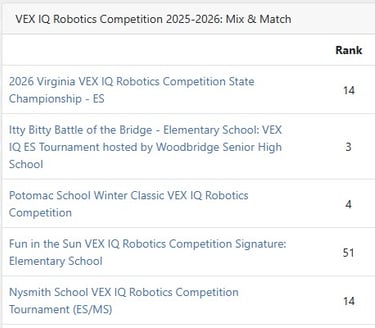 They ended up winning the Trifecta at Itty Bitty! They placed first in the finals winning Teamwork. Plus they finished first in the Skills challenge and won the Excellence award (combination of our robot's performance, plus their interview, plus their engineering notebook). This earned them a spot at the VA State Championships.