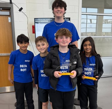 My second ('25/26) team is the Delta Bots - 25757B - and consists of two 5th graders from last year's team plus 2 new 4th graders. In four competitions so far this year they have won the Excellence, Teamwork, Skills, Innovate and Judges Awards and qualified for the Virginia State Championships.