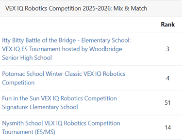 They continued practicing and making adjustments to the robot and it finally paid off! They ranked 4th at the Potomac tournament in January and 3rd at the Itty Bitty tournament in February. Both of those rankings got them into the finals. They finished 5th at Potomac and won the Innovate Award for their "Slapper" design that helps knock the pins into the robot's stacking area.